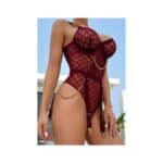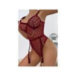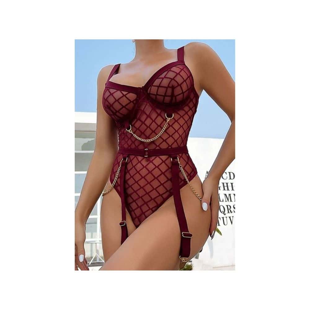 Moving down, the sheer mesh bodice clings to your curves, while the cheeky cut back adds just the right touch of tease. Meanwhile, the adjustable garter straps invite you to complete the look with your favorite thigh-highs for maximum impact.